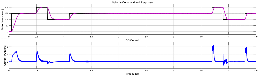 После настройки контроллеров ответ скорости электродвигателя переменного тока имеет более быстрый переходный процесс и меньшую установившуюся ошибку.