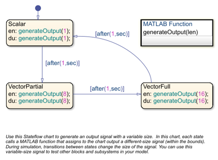 Как в графике VarSizeSignalSource, данные переменного размера не появляются в логике перехода или состояниях активности. Вместо этого состояния вызывают функции MATLAB, чтобы вычислить переменный размер выход. Переходы вызывают функцию MATLAB в условном операторе, чтобы оценить вход переменного размера.