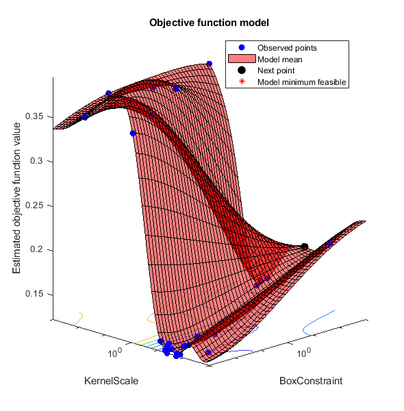 |=====================================================================================================| | Iter | Eval | Objective | Objective | BestSoFar | BestSoFar | BoxConstraint| KernelScale | | | result | | runtime | (observed) | (estim.) | | | |=====================================================================================================| | 21 | Accept | 0.12251 | 0.11771 | 0.12251 | 0.12461 | 0.0010166 | 0.018502 |