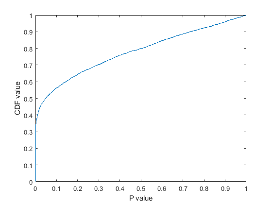 ecdf(p); xlabel('P value'); ylabel('CDF value')