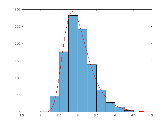 rng default; % For reproducibility xMaxima = max(randn(1000,500), [], 2); paramEstsMaxima = evfit(-xMaxima); y = linspace(1.5,5,1001); histogram(xMaxima,1.75:.25:4.75); p = evpdf(-y,paramEstsMaxima(1),paramEstsMaxima(2)); line(y,.25*length(xMaxima)*p,'color','r')