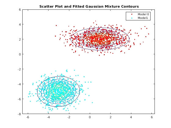 figure y = [zeros(1000,1);ones(1000,1)]; h = gscatter(X(:,1),X(:,2),y); hold on gmPDF = @(x1,x2)reshape(pdf(GMModel,[x1(:) x2(:)]),size(x1)); g = gca; fcontour(gmPDF,[g.XLim g.YLim]) title('{\bf Scatter Plot and Fitted Gaussian Mixture Contours}') legend(h,'Model 0','Model1') hold off