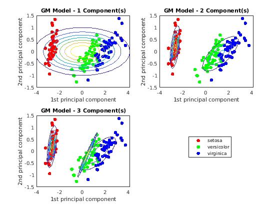 figure for j = 1:3 subplot(2,2,j) h1 = gscatter(score(:,1),score(:,2),species); h = gca; hold on gmPDF = @(x1,x2)arrayfun(@(x1,x2)pdf(GMModels{j},[x1(:) x2(:)]),x1,x2); fcontour(gmPDF,[h.XLim h.YLim],'MeshDensity',100) title(sprintf('GM Model - %i Component(s)',j)); xlabel('1st principal component'); ylabel('2nd principal component'); if(j ~= 3) legend off; end hold off end g = legend(h1); g.Position = [0.7 0.25 0.1 0.1];