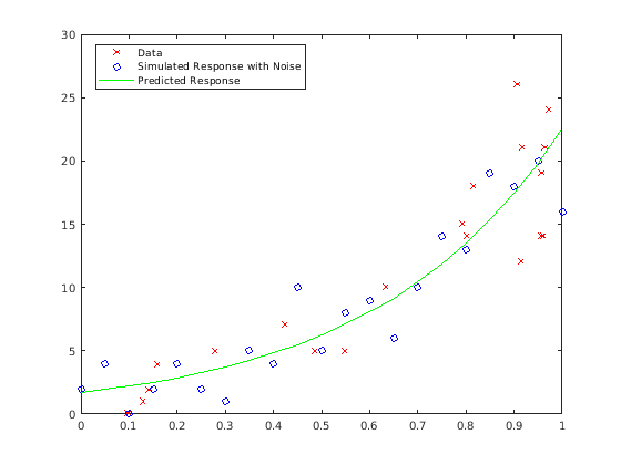 plot(X,y,'rx',Xnew,ysim,'bo',Xnew,feval(mdl,Xnew),'g-') legend('Data','Simulated Response with Noise','Predicted Response', ... 'Location','best')