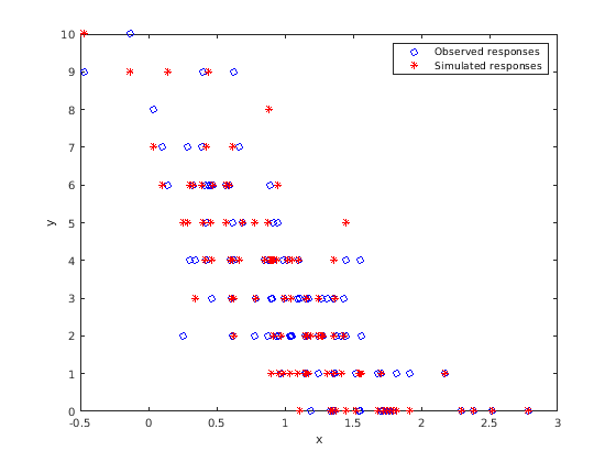 figure plot(x,y,'bo',x,ysim,'r*') legend('Observed responses','Simulated responses') xlabel('x') ylabel('y')