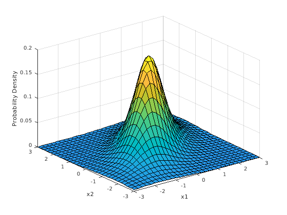 Rho = [1 .6; .6 1]; nu = 5; x1 = -3:.2:3; x2 = -3:.2:3; [X1,X2] = meshgrid(x1,x2); F = mvtpdf([X1(:) X2(:)],Rho,nu); F = reshape(F,length(x2),length(x1)); surf(x1,x2,F); caxis([min(F(:))-.5*range(F(:)),max(F(:))]); axis([-3 3 -3 3 0 .2]) xlabel('x1'); ylabel('x2'); zlabel('Probability Density');