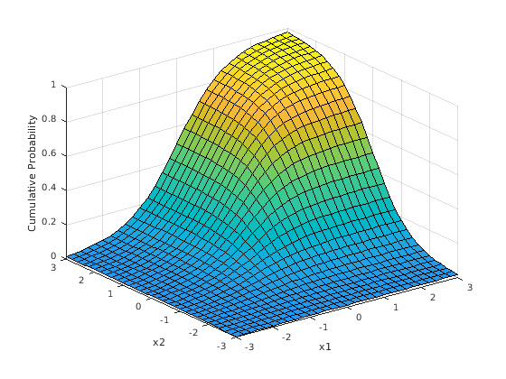 F = mvtcdf([X1(:) X2(:)],Rho,nu); F = reshape(F,length(x2),length(x1)); surf(x1,x2,F); caxis([min(F(:))-.5*range(F(:)),max(F(:))]); axis([-3 3 -3 3 0 1]) xlabel('x1'); ylabel('x2'); zlabel('Cumulative Probability');