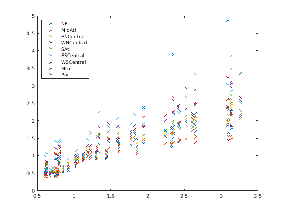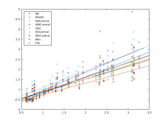 B = [beta(1:d)';beta(d+1:end)']; xx = linspace(.5,3.5)'; fits = [ones(size(xx)),xx]*B; figure; h = plot(x,Y,'x',xx,fits,'-'); for i = 1:d set(h(d+i),'color',get(h(i),'color')); end regions = flu.Properties.VarNames(2:end-1); legend(regions,'Location','NorthWest');