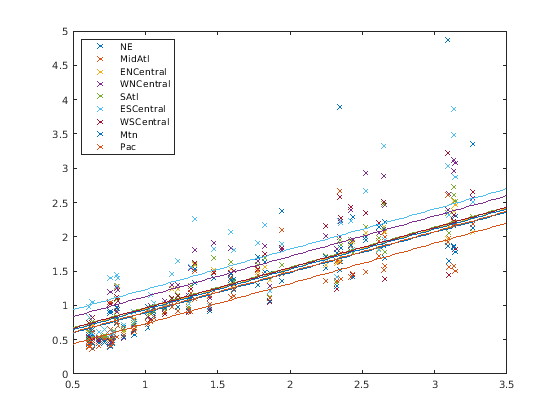 B = [beta(1:d)';repmat(beta(end),1,d)]; xx = linspace(.5,3.5)'; fits = [ones(size(xx)),xx]*B; figure; h = plot(x,Y,'x',xx,fits,'-'); for i = 1:d set(h(d+i),'color',get(h(i),'color')); end legend(regions,'Location','NorthWest');
