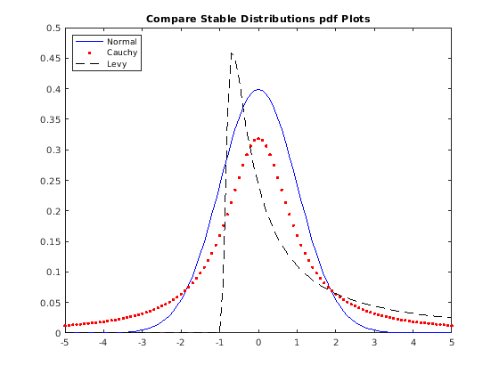 x = -5:.1:5; pdf_norm = pdf(pd_norm,x); pdf_cauchy = pdf(pd_cauchy,x); pdf_levy = pdf(pd_levy,x);