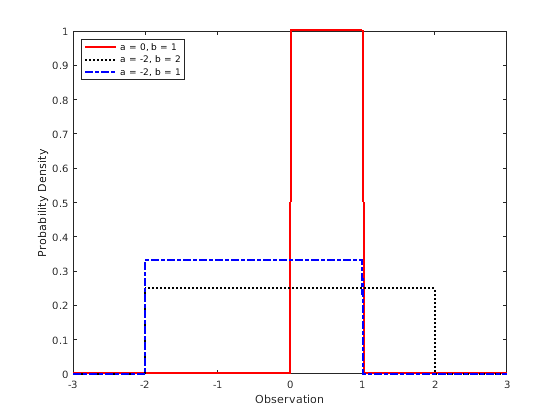 figure; plot(x,pdf1,'r','LineWidth',2); hold on; plot(x,pdf2,'k:','LineWidth',2); plot(x,pdf3,'b-.','LineWidth',2); legend({'a = 0, b = 1','a = -2, b = 2','a = -2, b = 1'},'Location','northwest'); xlabel('Observation') ylabel('Probability Density') hold off;