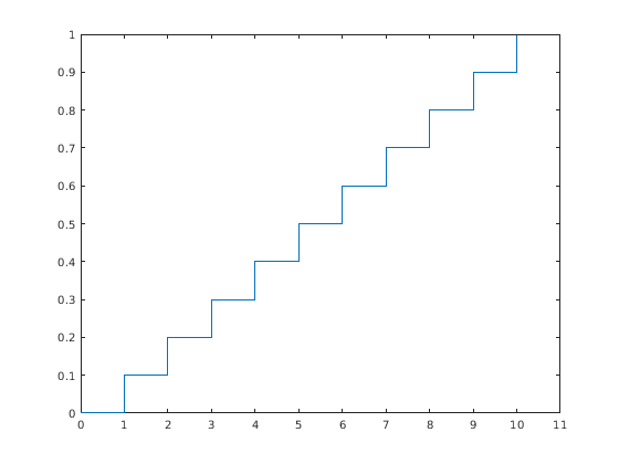 x = 0:10; y = unidcdf(x,10); figure; stairs(x,y) h = gca; h.XLim = [0 11];
