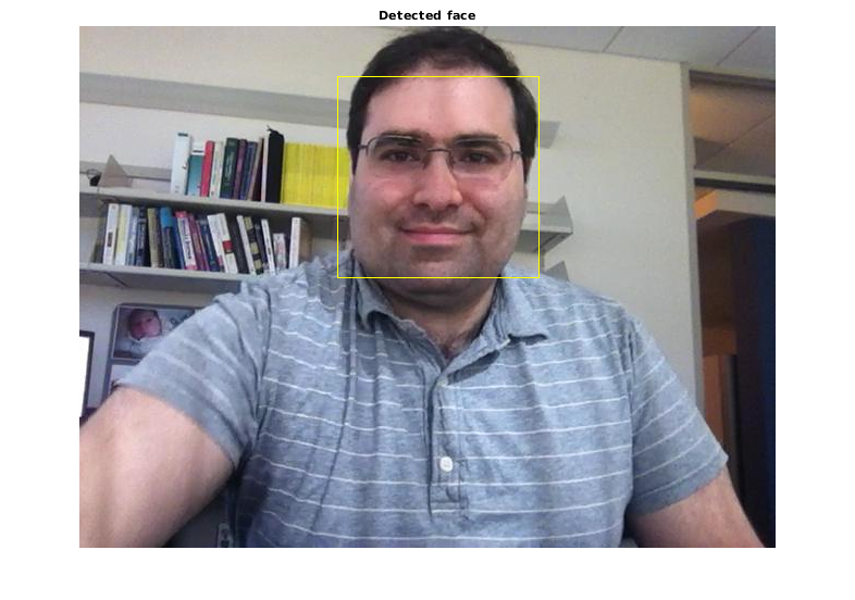 % Create a cascade detector object. faceDetector = vision.CascadeObjectDetector(); % Read a video frame and run the face detector. videoReader = VideoReader('tilted_face.avi'); videoFrame = readFrame(videoReader); bbox = step(faceDetector, videoFrame); % Draw the returned bounding box around the detected face. videoFrame = insertShape(videoFrame, 'Rectangle', bbox); figure; imshow(videoFrame); title('Detected face');