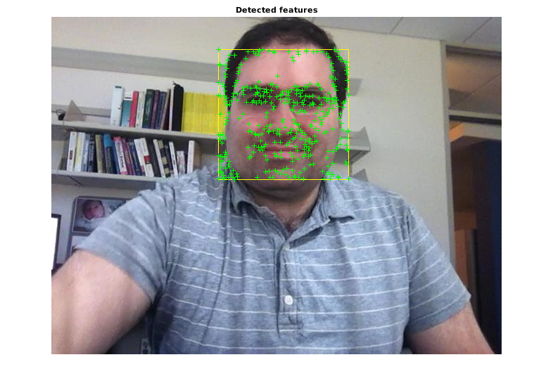 points = detectMinEigenFeatures(rgb2gray(videoFrame), 'ROI', bbox); % Display the detected points. figure, imshow(videoFrame), hold on, title('Detected features'); plot(points);