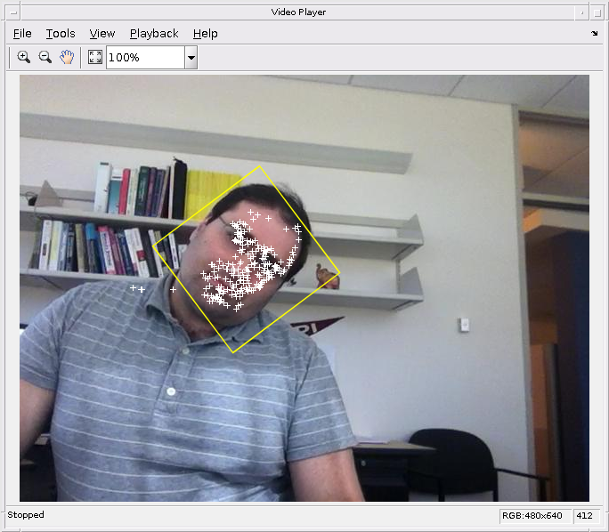 oldPoints = points; while hasFrame(videoReader) % get the next frame videoFrame = readFrame(videoReader); % Track the points. Note that some points may be lost. [points, isFound] = step(pointTracker, videoFrame); visiblePoints = points(isFound, :); oldInliers = oldPoints(isFound, :); if size(visiblePoints, 1) >= 2 % need at least 2 points % Estimate the geometric transformation between the old points % and the new points and eliminate outliers [xform, oldInliers, visiblePoints] = estimateGeometricTransform(... oldInliers, visiblePoints, 'similarity', 'MaxDistance', 4); % Apply the transformation to the bounding box points bboxPoints = transformPointsForward(xform, bboxPoints); % Insert a bounding box around the object being tracked bboxPolygon = reshape(bboxPoints', 1, []); videoFrame = insertShape(videoFrame, 'Polygon', bboxPolygon, ... 'LineWidth', 2); % Display tracked points videoFrame = insertMarker(videoFrame, visiblePoints, '+', ... 'Color', 'white'); % Reset the points oldPoints = visiblePoints; setPoints(pointTracker, oldPoints); end % Display the annotated video frame using the video player object step(videoPlayer, videoFrame); end % Clean up release(videoPlayer);
