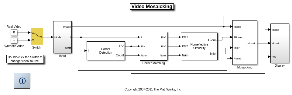 Входная подсистема загружает видео последовательность или из файла или генерирует синтетическую видео последовательность. Выбор является определяемым пользователем. Во-первых, блок Corner Detection находит точки, которые являются соответствующими между последовательными системами координат Угловой подсистемой Соответствия. Затем блок Estimate Geometric Transformation вычисляет точную оценку матрицы преобразования. Этот блок использует алгоритм RANSAC, чтобы устранить точки ввода выброса, уменьшая ошибку вдоль швов выходного изображения мозаики. Наконец, подсистема Mosaicking накладывает текущий видеокадр на выходное изображение, чтобы сгенерировать мозаику.