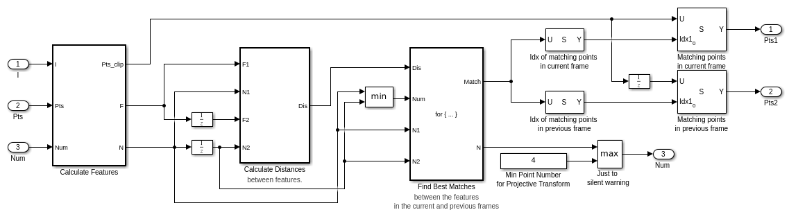 Подсистема находит угловые функции в текущем видеокадре в одном из трех методов. Пример использует Локальное сравнение интенсивности (Rosen & Drummond), которая является самым быстрым методом. Другие доступные методы являются детектированием углов методом Харриса (Harris & Stephens) и Минимальное Собственное значение (Shi & Tomasi).