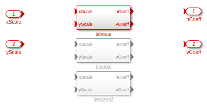В imresize (прореживают) подсистему, input_conversion и output_conversion подсистемы преобразуют цветовое пространство пиксельного потока на основе параметра на маске. valid_gen_horizontal и valid_gen_vertical подсистемы возвращают управляющие сигналы, которые используются в генерации коэффициентов и восстановлении шины элемента управления выводом. Если последняя линия изображения не содержит допустимых пикселей после того, как субдискретизация, ctrlBusRebuild подсистема восстановит шину управления для нового размера.
