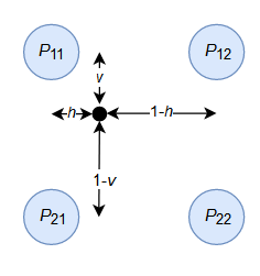 Билинейная интерполяция определяет вставленное пиксельное значение из взвешенного среднего этих четырех входных пикселей, самых близких к вставленному местоположению.