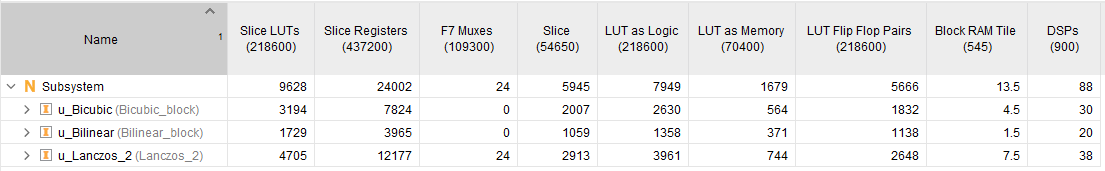 Эти таблицы показывают, что использование ресурсов для imresize (прореживает) подсистему с вводом видео на 240 пунктов и не включает фильтр lowpass или Пиксельный Поток FIFO. Проект синтезировался, чтобы достигнуть частоты часов 150 МГц.