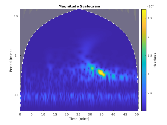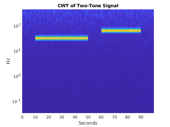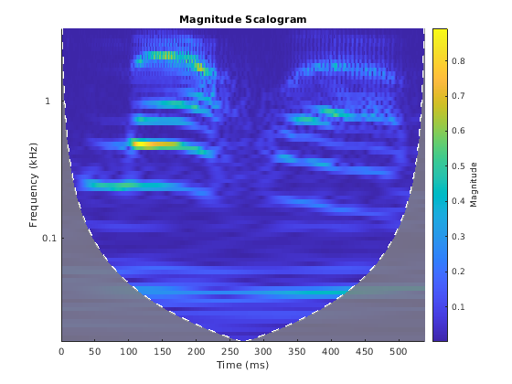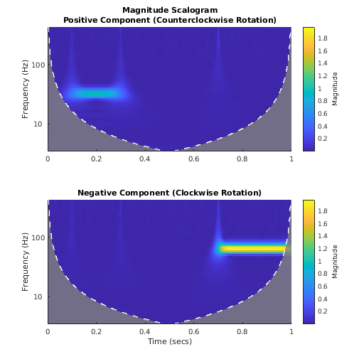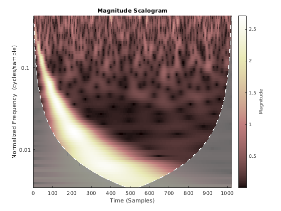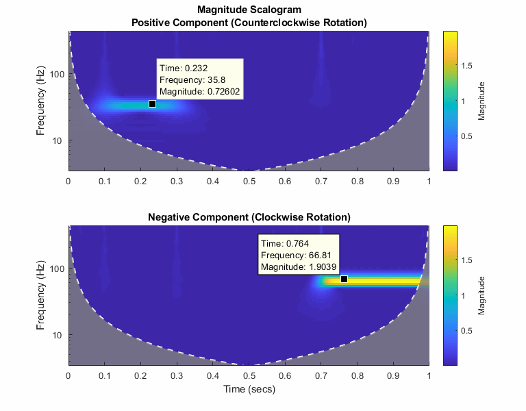 cwt(___) без выходных аргументов строит CWT scalogram. scalogram является абсолютным значением CWT, построенного как функция времени и частоты. Частота построена на логарифмическом масштабе. Конус влияния, показывающего, где краевые эффекты становятся значительными, также построен. Серые области вне пунктирной белой линии формируют рисунок областей, где краевые эффекты являются значительными. Если входной сигнал с комплексным знаком, положительное (против часовой стрелки) и отрицательный (по часовой стрелке), компоненты построены в отдельном scalograms.