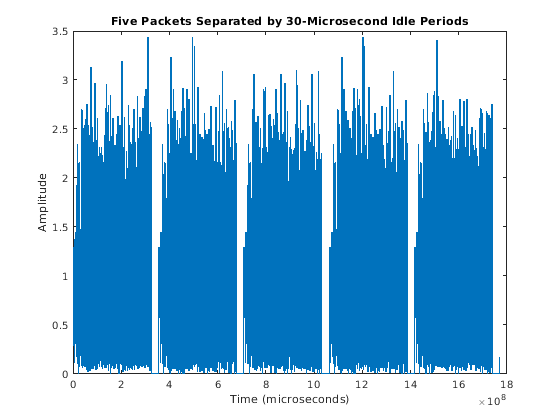 numPkts = 5; bits = [1;0;0;1]; scramInit = randi([1 127],numPkts,1); txWaveform = wlanWaveformGenerator(bits,cfg,'NumPackets',numPkts,'IdleTime',30e-6,'ScramblerInitialization',scramInit); time = [0:length(txWaveform)-1]/80e-6; plot(time,abs(txWaveform)); title('Five Packets Separated by 30-Microsecond Idle Periods'); xlabel ('Time (microseconds)'); ylabel('Amplitude');