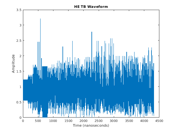 waveform = wlanWaveformGenerator(psdu,cfgHETB); figure; plot(abs(waveform)); title('HE TB Waveform'); xlabel('Time (nanoseconds)'); ylabel('Amplitude');