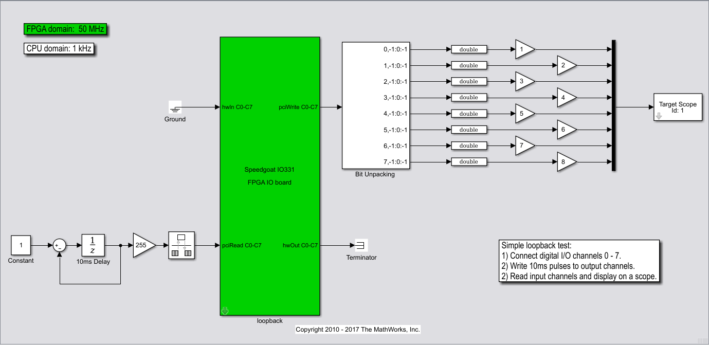 Модули ввода-вывода FPGA включают свой собственный локальный ввод-вывод, включая цифровой и аналоговый вход и выводят каналы. Для получения дополнительной информации о модулях FPGA, см. Поддержку FPGA Speedgoat с HDL Workflow Advisor.