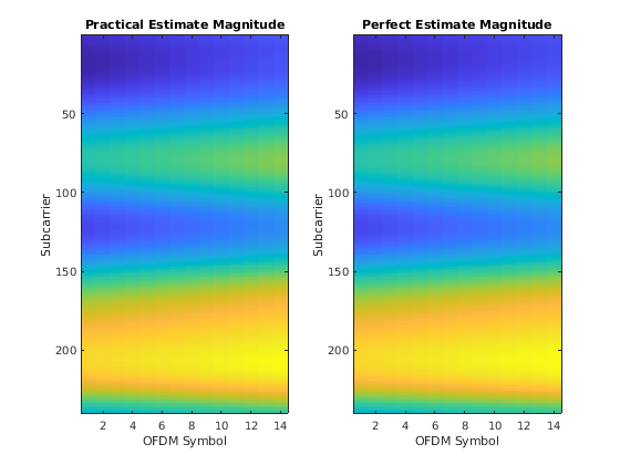 figure; subplot(1,2,1); imagesc(abs(H)); xlabel('OFDM Symbol'); ylabel('Subcarrier'); title('Practical Estimate Magnitude'); subplot(1,2,2); imagesc(abs(H_ideal)); xlabel('OFDM Symbol'); ylabel('Subcarrier'); title('Perfect Estimate Magnitude');