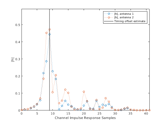 [ выполняет совершенную оценку синхронизации. Чтобы найти пик импульсной характеристики канала, функция сначала восстанавливает импульсную характеристику от усилений пути к каналу offset,mag] = nrPerfectTimingEstimate(pathGains,pathFilters)pathGains и путь фильтрует импульсную характеристику pathFilters. Импульсная характеристика канала усреднена через все снимки состояния канала и суммирована через всю передачу, и получите антенны прежде, чем синхронизировать оценку. Функция возвращается, предполагаемая синхронизация возместила offset и величина импульсной характеристики канала mag.
