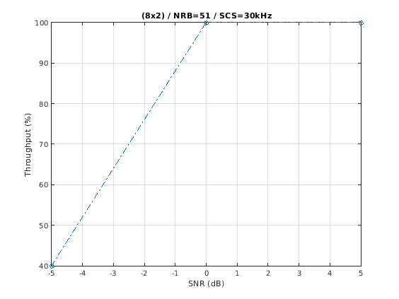 figure; plot(snrIn,simThroughput*100./maxThroughput,'o-.') xlabel('SNR (dB)'); ylabel('Throughput (%)'); grid on; title(sprintf('(%dx%d) / NRB=%d / SCS=%dkHz',... nTxAnts,nRxAnts,carrier_init.NSizeGrid,carrier_init.SubcarrierSpacing)); % Bundle key parameters and results into a combined structure for recording simResults.simParameters = simParameters; simResults.simThroughput = simThroughput;