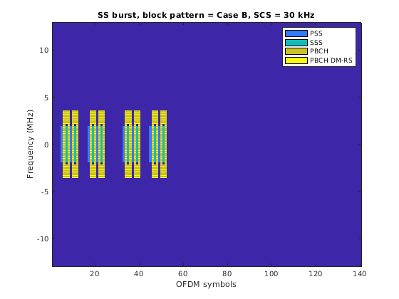 txBurst.BlockPattern = prm.SSBlockPattern; txBurst.SSBTransmitted = prm.SSBTransmitted; txBurst.NCellID = prm.NCellID; txBurst.SSBPeriodicity = 20; txBurst.NFrame = 0; txBurst.Windowing = 0; txBurst.DisplayBurst = true; % Assume same subcarrier spacing for carrier as the burst carrier = nrCarrierConfig('NCellID',prm.NCellID,'NFrame',txBurst.NFrame); carrier.SubcarrierSpacing = prm.SCS; carrierInfo = nrOFDMInfo(carrier); txBurst.SampleRate = carrierInfo.SampleRate;