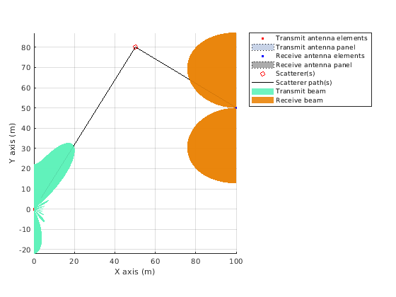 Эти графики подсвечивают шаблон направленности передачи, получают шаблон направленности и пространственную сцену, соответственно. Результаты зависят от отдельных направлений луча, используемых для разверток. Пространственная сцена открывает объединенный вид передачи, и получите массивы и соответствующие решительные лучи, наряду с рассеивателями.