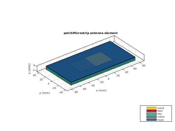 sub = dielectric('Name',{'FR4','Teflon','Foam'},'EpsilonR',... [4.80 2.10 1.03],'Thickness',[0.002 0.004 0.001],... 'LossTangent',[0.0260 2e-04 1.5e-04]);