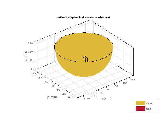 создает сферическую поддержанную отражателем антенну. Объект антенны по умолчанию имеет возбудитель как питаемый центром диполь, расположенный на плоскости X-Y. Размерности объекта антенны по умолчанию выбраны для рабочей частоты 1 ГГц.ant = reflectorSpherical