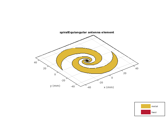spiralEquiangular объект является плоской антенной логарифмической спирали на плоскости X-Y. Логарифмическая спираль всегда является питаемым центром и имеет две руки. Полевые характеристики антенны являются независимой частотой. Осуществимая спираль имеет конечные пределы на питающейся области и наиболее удаленной точке любой руки спирали. Эта антенна предоставляет широкополосное поведение. Внешний радиус накладывает низкочастотное ограничение, и внутренний радиус накладывает высокочастотное ограничение. Радиус руки растет линейно как функция угла намотки. В результате внешние руки спирали формируются, чтобы минимизировать отражения.