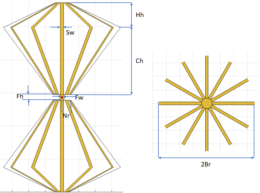 Размерности, показанные в этом рисунке, используются, чтобы создать проводную биконическую антенну, чтобы покрыть частотный диапазон 300 МГц к 1 ГГц, который является областью значений UHF для EMI и приложения тестирования EMC.