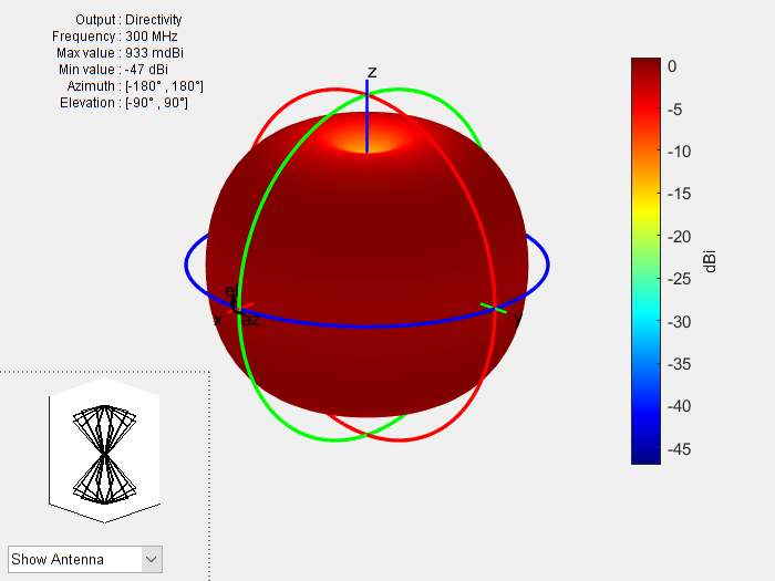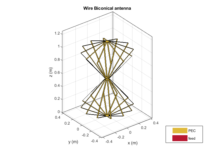 Этот пример проектирует проводную биконическую антенну с устойчивым импедансом по широкому диапазону частот 300 МГц к 1 ГГц. Этот диапазон частот имеет плоские характеристики усиления, который является всенаправленным в H-плоскости и двунаправленным в электронной плоскости как полуволновая дипольная антенна.