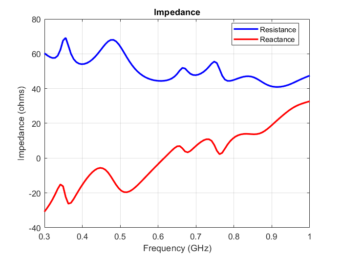 freq = linspace(300e6,1e9,101); figure; impedance(ant,freq);
