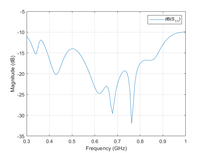 Спроектированная проводная биконическая антенна обеспечивает отражательный коэффициент меньше, чем-10dB для желаемой операционной частоты без соответствующей сети или симметрирующего трансформатора. Таким образом спроектированная антенна предпочтена в приложениях EMC. Широкополосное покрытие и компактный размер являются главными преимуществами этой антенны. Мы выбираем частотный диапазон от 0,3 ГГц до 1 ГГц и вычисляем S-параметры антенны.