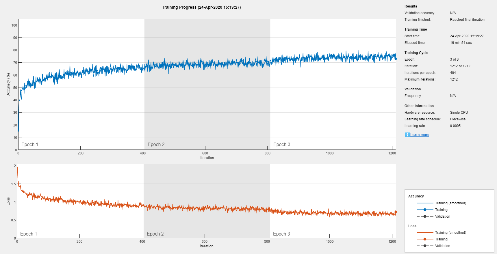 miniBatchSize = 512; initialLearnRate = 0.005; learnRateDropPeriod = 2; maxEpochs = 3; options = trainingOptions("adam", ... "MiniBatchSize",miniBatchSize, ... "InitialLearnRate",initialLearnRate, ... "LearnRateDropPeriod",learnRateDropPeriod, ... "LearnRateSchedule","piecewise", ... "MaxEpochs",maxEpochs, ... "Shuffle","every-epoch", ... "Verbose",false, ... "Plots","Training-Progress");