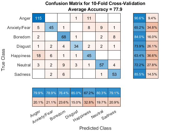 cm.Title = sprintf('Confusion Matrix for 10-Fold Cross-Validation\nAverage Accuracy = %0.1f',valAccuracy);