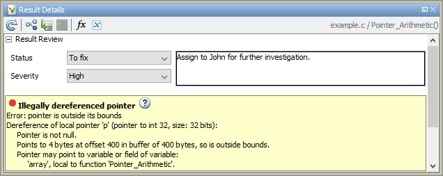 Кликните по заголовку столбца Family, чтобы отсортировать результаты на основе того, насколько очень важный они. Выбор красный Illegally dereferenced pointer регистрируется в файле example.c. Красная проверка указывает, что ошибка происходит на всех путях к выполнению, рассмотренных в анализе.