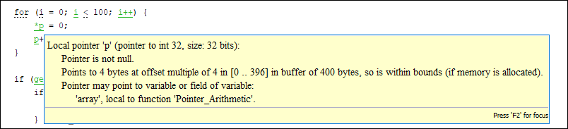 Для результата Illegally dereferenced pointer сообщение на панели Result Details указывает что указатель p имеет позволенный буфер 400 байтов. Это указывает на местоположение, которое начинается на уровне 400 байтов с начала буфера и указывает на тип данных 4 байтов.