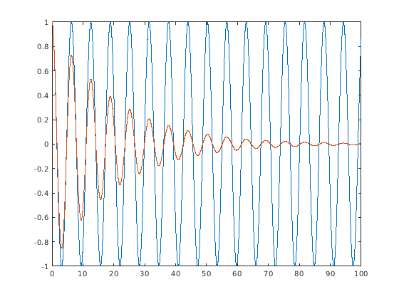 Как прежде, амплитуда и постоянная фаза определяются исходным положением и начальная скорость из ослабленного генератора. Основной эффект затухания состоит в том, чтобы заставить амплитуду затухать экспоненциально. В этом примере, класс MATLAB dampedOscillator который является подклассом simpleOscillator моделирует ослабленную систему.