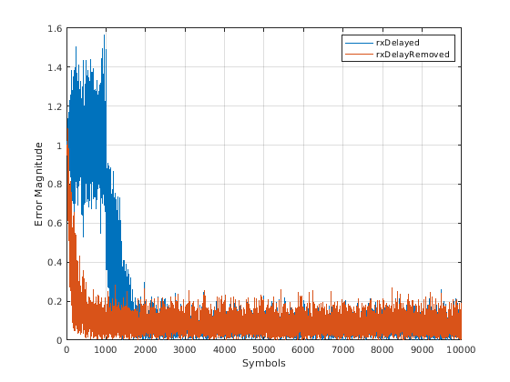 figure plot([abs(err1),abs(err2)]) xlabel('Symbols') ylabel('Error Magnitude') legend('rxDelayed','rxDelayRemoved') grid on