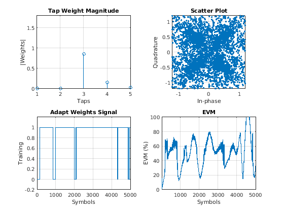 for p=1:numPackets data = randi([0 M-1],numSymbols,1); tx = pskmod(data,M,pi/4); rx = awgn(raylChan(tx),SNR); rxDelay = finddelay(rx,tx); [y,err,wts] = lineq(rx,adaptWeights); y = phaseCorrection(y); evmEst = evm(y); adaptWeights = (evmEst > 20); updateFigures(errPlot,evmPlot,scatSym,adaptState, ... wts,y(end),evmEst,adaptWeights,p,numPackets) end
