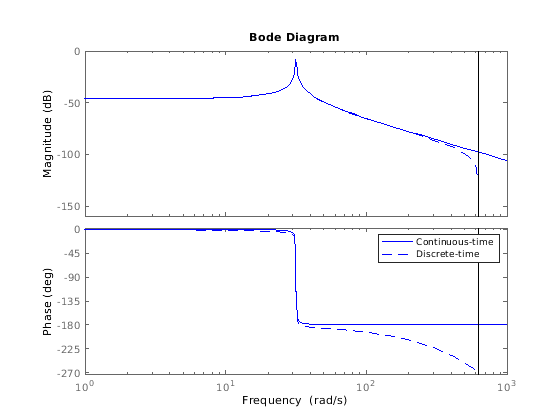 bodeplot(H,'-',Hd,'--') legend('Continuous-time','Discrete-time')
