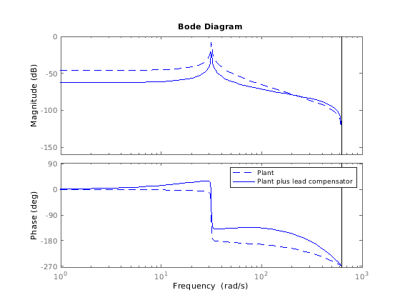 bodeplot(Hd,'--',oloop,'-') legend('Plant','Plant plus lead compensator')