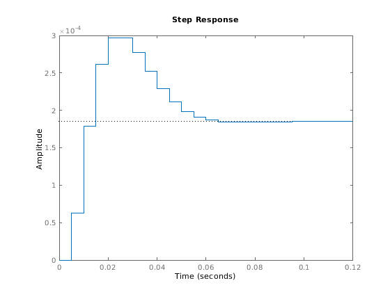 Дискретизируйте модель. Поскольку у контроллера будет цифро-аналоговый преобразователь (с нулевым порядком, содержат), соединенный с его входом, используйте c2d команда с 'zoh' метод дискретизации.